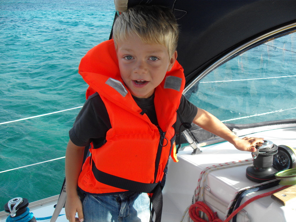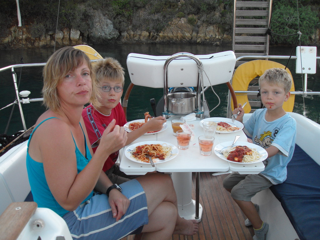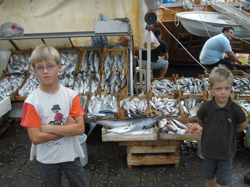 Sonne und Wind.Da wir bei guten 4-5 Windstärken Raumschots segeln konnten,beschlossen wir am heutigen Tag etwas weiter als geplant zu segeln, da wir ja morgen wieder in Bodrum sein mussten. Auf der suche nach einem geeigneten Ankerplatz mussten wir leider schnell feststellen das eine Reihe von Buchten für die bevorstehende Nacht sehr unruhig waren. Wir fanden einen guten Ankerplatz, aber die Vorsicht war mit uns.Also besorgten wir uns per SMS einige Wetterberichte , die alle weiter auffrischenden Wind ansagten. Deshalb wurden Vorkehrungen an Bord getroffen – Anker geprüft, zusätzliche Leine ausgebracht, Navigerät genau eingestellt, Vorsegel fest angebunden usw.. Bis 23.00 Uhr saßen wir noch im windgeschützten Cockpit und beobachteten das Wetter. Bis auf einige Kontrollgänge verlief die Nacht ruhig. Am nächsten Tag war wieder Sonne und Wind. Heute hatten wir es nicht so eilig und deshalb wurde noch ein wenig geangelt-mit Erfolg. Matrose Malte angelte eine Seeschlange und einen Fisch und Leonard gleich 2 Fische ,nur leider viel zu klein. Die großen Fische waren schlau und tummelten sich unterm Boot. Gegen 11.00 Uhr segelten wir dann bei 25 Knoten. Mit gut 7 Knoten Fahrt erreichten wir gegen 15 Uhr unseren Ausgangshafen. Nach einem gelungenen Tankmanöver lagen wir gegen 16.00 Uhr wieder an Steg C.Die Rückgabe des Bootes verlief ohne Probleme. Den Abend verbrachten wir in der wunderschönen Bodrumer Altstadt und schlenderten durch den Hafen zur Burg an den vielen Gulets vorbei und an einem prall gefüllten Fischstand.