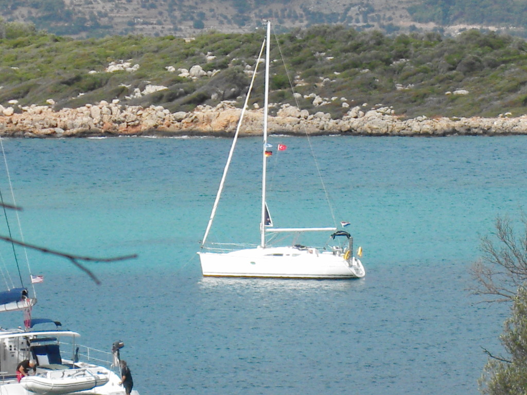 Ablegen in Richtung Yali ,wo es etwas Kultur zu bestaunen geben soll. Die Stimmung an Bord war gut, nur die Gräte im Hals des Kapitäns steckte fest und es sollte noch besser kommen. Etwas abseits der Hauptinsel begab sich die Crew auf Landgang und wir mussten leider feststellen, das der Weg zur Ruine doch zu weit war.Also wider rein ins Schlauchboot und hups beim Einsteigen tritt der Kapitän auch noch in einen Seeigel, an Bord angekommen dann auch noch barfuß der Tritt in eine Wespe und so langsam machte der Tag so richtig Spass.Nachdem die beiden Stachel im Fuß raus waren, wurde das Boot noch einmal umgeparkt und dann gings nun endlich zur Ruine und einen wunderschönen Badestrand-Betreten leider verboten.Es sah aus wie ein Stück Ostseestrand im Mittelmeer nur viel blauer.gegen 15 Uhr segelten wir weiter und wurden nach 3 Stunden segeln von 2 netten Türken am Steg empfangen.Nachdem das obligatorische Anlegebier getrunken war und die Jungs den 3. Fisch an der Angel hatten, machten wir uns landfein um die Gegend zu erkunden.Den Abend verbrachten wir ineiner kleinen Hafenkneipe mit Blick auf unser Schiff.Nach gutem Essen und Wein war dann auch die Gräte aus meinem Hals verschwunden.