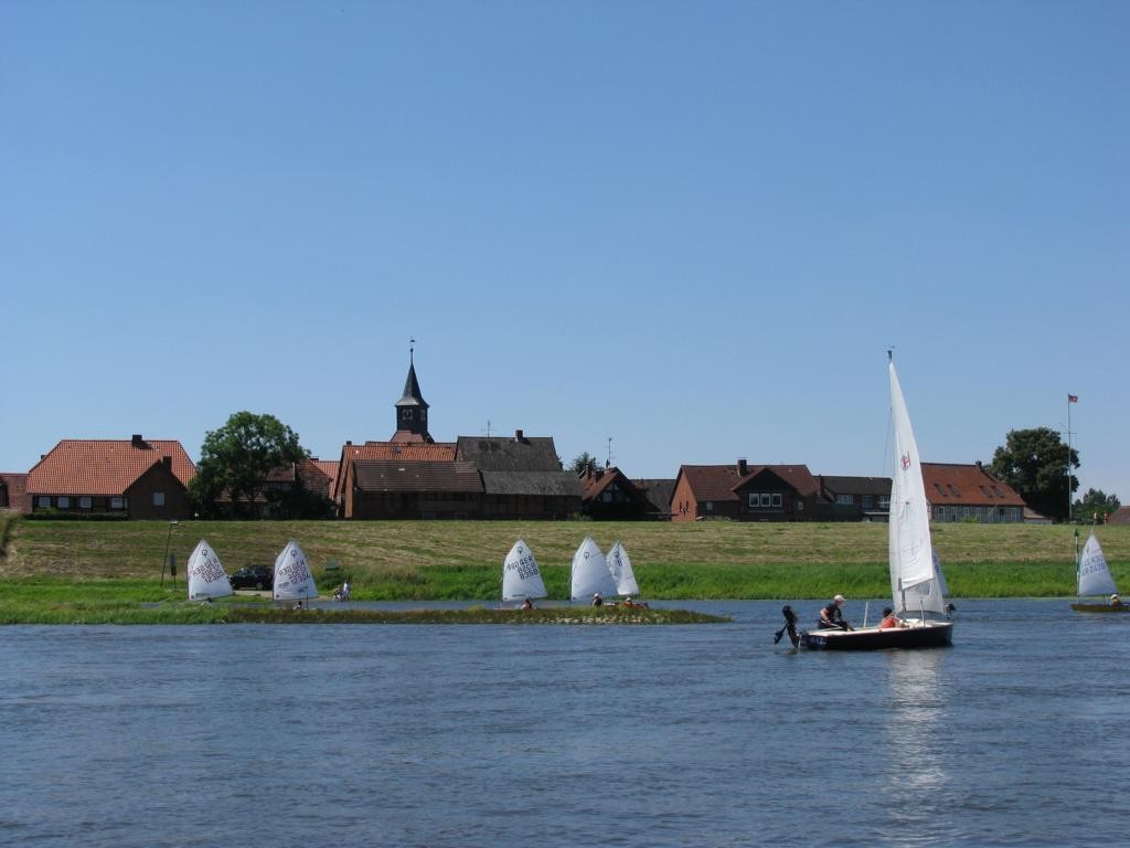 28.07.2012 Nach einer regereichen Nacht begrüßt uns der Morgen in Tespe mit Sonne. Leider reicht die aber tatsächlich nur für das Frühstück. Wie geplant machen wir uns auf den Weg zur 6 km entfernten Schleuse Geesthacht. Leider zieht sich der Himmel immer mehr zu. Auf der Elbe können wir kaum mehr 2-3 km weit sehen. Nach rund fünf km Schleppfahrt, die jungen Segler sitzen dabei in Ihren Booten, kommen wir auf den breitesten Teil der Elbe, kurz vor dem Wehr in Geesthacht. In der Anfahrt auf den Schleusenkanal bekommen wir die Stärke des Windes deutlich zu spüren, hier wo er sich mehrere km ungehindert gegen die Strömung der Elbe stellen kann, entstehen hohe Wellen. Als uns dabei ein Ausflugsdampfer überholt und eine Kreuzsee produziert, merken wir, dass diese Bedingungen unsere Ausrüstung überfordern. Schweren Herzens mussten wir den Versuch, auf der Tiden-Elbe bis nach Oortkaten zu fahren, abbrechen. Die Risiken waren zu diesem Zeitpunkt einfach nicht überschaubar. Keine Frage: Safety First! So endet die Elbesail 2012 nicht ganz in Hamburg. Aber fast 200 km auf der Elbe sind für unsere jungen Segler auch ein tolles Erlebnis.